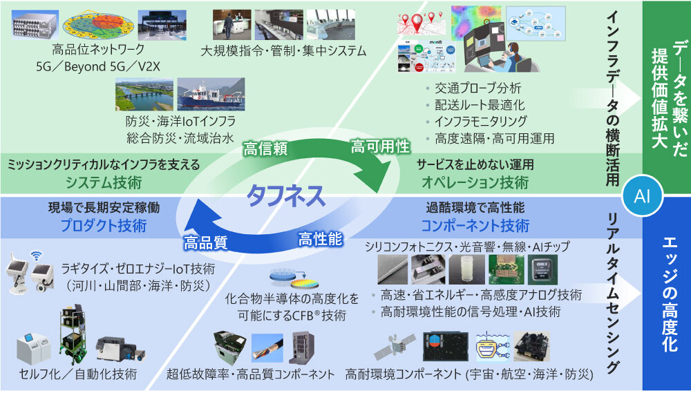 技術戦略は、中期経営計画のキーメッセージ「社会の大丈夫をつくっていく。」が示す、安心・便利な社会インフラを「止まらない/止めない」ために培ってきた技術・ノウハウを、未来に向かって持続的に高度化するためのものです。この長年培ってきたOKIのコアコンピタンスを「タフネス」と定義しました(図1)。