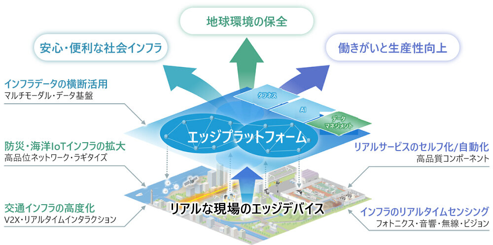 エッジプラットフォームは、多様なエッジのコンポーネントとデータのコンビネーションを加速し、お客様の多様な課題をスピーディーに解決するソリューション基盤の技術コンセプトと位置付けています。エッジの高度なコンポーネントとそこから生じるデータを、これまでの事業やサービスの枠にとらわれずに共通・共用化を進めることで、パートナーの皆様との連携も容易化し、新しいソリューションを、多様なコンポーネントとデータのコンビネーションで素早く構築できます。さらには強みに集中して技術を高度化できるようになります。
