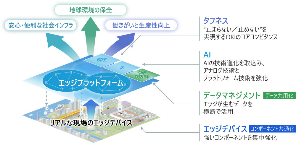 OKIは「中期経営計画2025(参考文献1)」で、将来事業の創出を実現するための技術コンセプト「エッジプラットフォーム」を発表し(参考文献2)、11月のOKI IR DAYでその技術戦略を発表した。これは「エッジプラットフォーム」の2031年までの技術戦略であり、「コアコンピタンスのタフネス」「エッジプラットフォームの定義」「エッジプラットフォームを構成する四つのポイント」「エッジプラットフォームを強化する施策」そして「五つの注力技術領域」について述べている。本稿では、技術戦略のうち「エッジプラットフォームを強化する施策」、「五つの注力技術領域」そしてその注力技術の具体例について説明する。