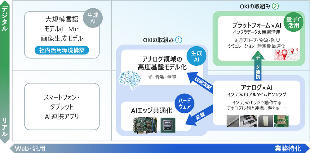 OKIの特徴はエッジ領域での強みである。この強みをさらに高め、得られたデータを総合的に活用することでAIを強化していく。まずエッジ領域では、高度なアナログ技術を用いたセンサーとAIを組み合わせことで、社会インフラのような止めることが許されない現場を深く理解するリアルタイムセンシング技術を強化する。このエッジ領域のAI(AIエッジ)は、小型で省電力なAIチップを備えた機能モジュールや、高度なCPU/GPUを備えたモジュールを共通化することで実現する。これにより、過酷環境ならではのデータを多数収集することができるようになる。