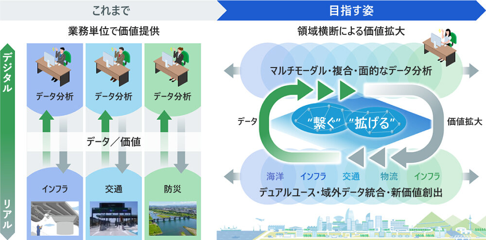 さまざまなインフラデータを共用化し横断活用するためのデータ連携プラットフォーム、現場業務の高度化やデジタルツイン、最適化シミュレーションなど、データの活用技術を開発する。プラットフォーム領域の技術により、デュアルユースや広域シミュレーションなど業務や領域を超えたデータ活用を実現する。