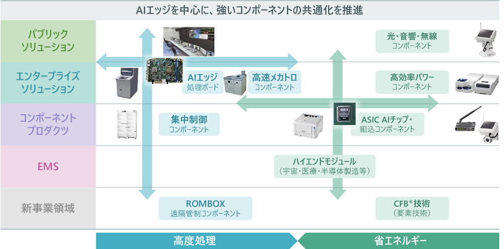搬送効率の向上や、性能を維持しながらの部品削減など新しい機構要素技術に取り組む。半導体技術を活用し、AI機能を持つ省電力高機能コアデバイスの開発や、このデバイスを中心としたAIエッジコンポーネントを開発する。これらの技術をOKIのあらゆる装置で活用できるよう共通化を進めることで、開発効率向上と技術強化を両立する。