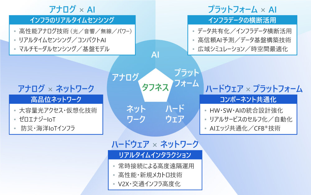 このような各領域での技術強化と融合により、提供価値を拡大する。「アナログ×AI」の融合では、光・音・電波のセンサー特性に応じた信号処理と機械学習を組み合わせ、リアルタイムセンシングを実現する。「プラットフォーム×AI」では、インフラデータの横断活用を容易にする技術と時空間シミュレーションの利用で、交通・災害・老朽化の予測や最適化を行う。「ハードウェア×プラットフォーム」では、部品だけでなく設計・製造も含めたプラットフォーム化によりコンポーネント共通化を進める。「ハードウェア×ネットワーク」では、遠隔運用や高度な交通インフラを見越したリアルタイムインタラクションを、「アナログ×ネットワーク」では、多様なIoTセンサーとの高品位なネットワーク連携を提供する。