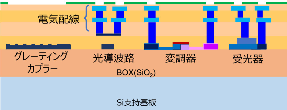 光技術を用いた通信機器やセンサー装置は、従来、個別の光部品を光ファイバーで配線して光回路を構成していたが、サイズの制約があった。この制約に対し、シリコンフォトニクス技術を用いることで、光回路を僅か数mm角のシリコンチップ上に集約し解決した。さらに、この技術により低コスト化と低消費電力化も期待できる。具体的な構成は、シリコンによる光導波路をBOX(シリコン酸化膜)層の上に形成し、イオン注入やゲルマニウムを堆積して電気配線を追加することにより変調器や受光器なども実現可能である(図7)。