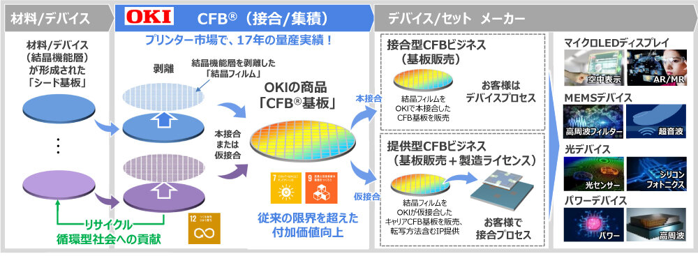 OKIは、LEDとICの独自の異種材料接合技術により一体化するCFB(Crystal Film Bonding)(注1)技術の量産化に、2006年に世界に先駆けて成功した(参考文献1)。以来、一体化されたLED素子の出荷実績は1,000億ドットを超え、量産信頼性の高いコア技術として確立した。