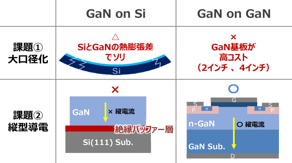 一方、GaN on GaNは、GaN基板上にGaN成長する理想的な技術である。格子定数は一致し、バッファー層は不要なため、縦型導電が可能である。しかし、基板コストが非常に高いため、基板径が2~4インチに限定され大口径が実現できていないため、普及には至っていない。
