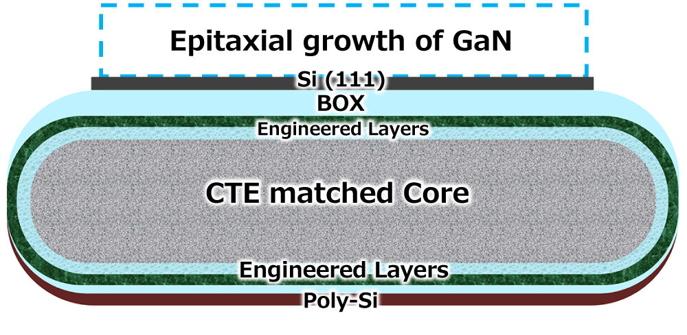 課題①大口径化を実現するQST基板の構造を図4に示す。QST基板は、GaNにCTEが近い多結晶AlNを含むCTE matched Coreが中心にあり、その周囲を複数層の無機膜で構成されるエンジニア層でコーティングしている。上面は、BOX(埋め込み酸化膜)層を介して、Si(111)が形成されているため、QST基板上にGaNの結晶成長が可能である。