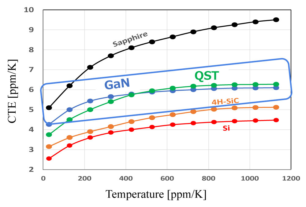 QST基板の最大の特長は、図5に示すように、広範囲な温度で、GaNとCTEが近いことであり、以下のような多くの優位性をもつ。