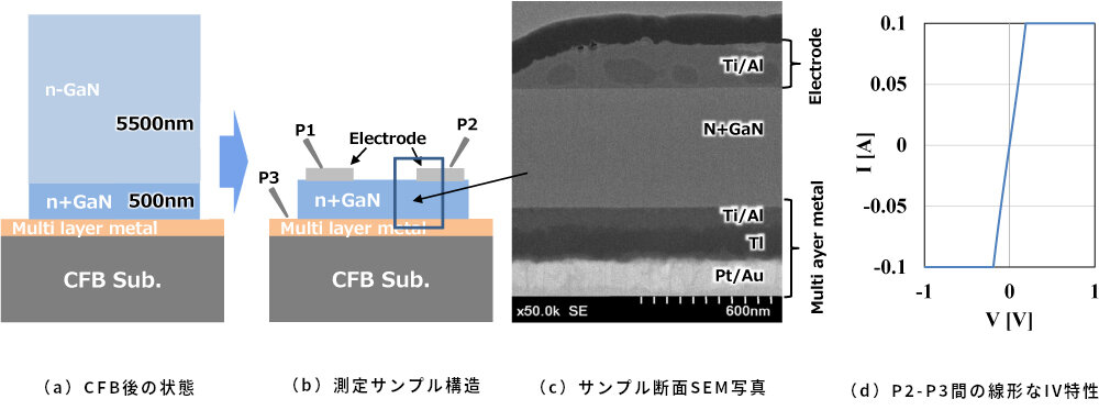 試作したデバイスの電気特性評価結果として、CFB界面のコンタクト抵抗値を明らかにした(図7)。CFBしたn+GaN(Siドープ濃度5x1018)サンプルの構造とコンタクト抵抗測定方法を示す。図7(a)はCFB後の状態であり、n-GaNは厚み5500nm、n+GaNは厚み500nmである。CFB Sub.は、N型のSi(100)基板を用いた。図7(a)に対し、n-GaNをドライエッチングし、n+GaNを露出させ、表面2か所にTi/Al電極を形成し、600℃の熱処理を行った。完成した測定サンプルの断面構造を図7(b)に示す。図7(c)は断面SEM写真であり、n+GaNに対しTi/Alのコンタクト電極を形成した。