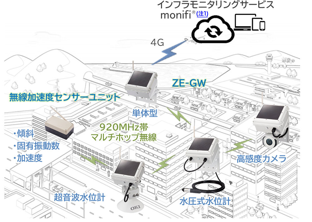 このような問題に対して、OKIは、橋梁(りょう)や斜面、鉄塔などのインフラの健全度や災害発生時の現場状況を遠隔から監視できるインフラモニタリングシステム「ゼロエナジーIoTシリーズ」を開発し、インフラ管理者の維持管理業務や災害対応業務を支援する防災DXの実現に取り組んでいる。
