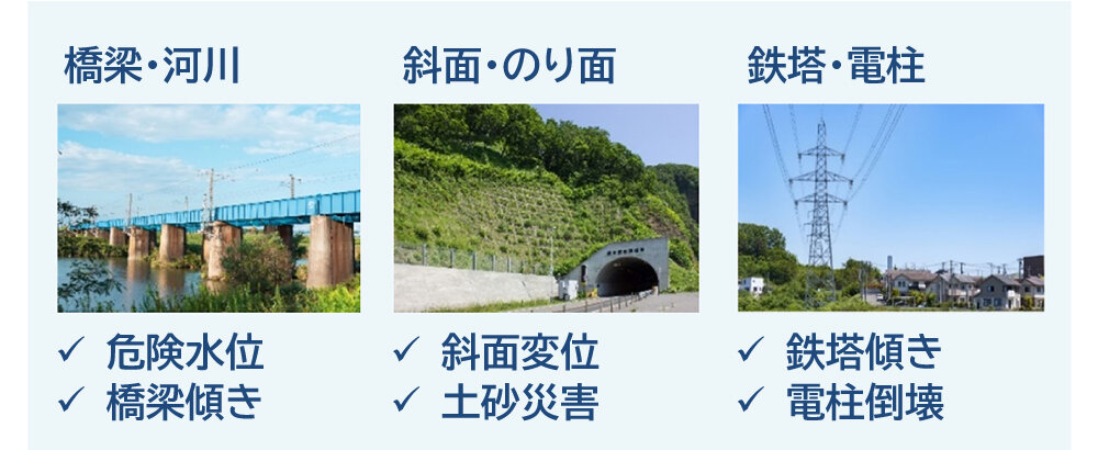 豪雨などの影響により、斜面で地すべりが発生する災害が増加し、斜面周辺の安全確認が重要となっている。鉄道、道路、鉄塔などの周辺で、斜面の地すべり発生が懸念される場合には、定期的、あるいは、豪雨が発生した際に、インフラ管理者が現場に出向いて目視で状況を確認している場合がある。