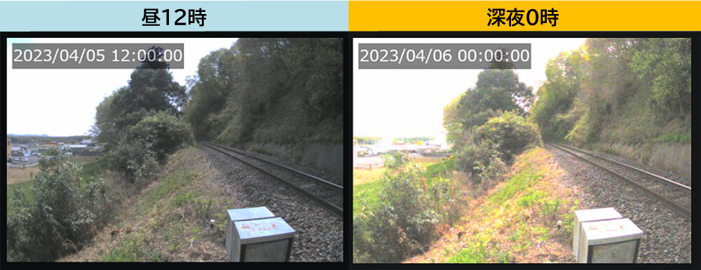 このような状況に対して、ゼロエナジーゲートウェイ高感度カメラ付を導入することにより、豪雨発生時の斜面の状況を遠隔で監視できる。図4に斜面モニタリング撮影画像の例を示す。高感度撮影により、深夜0時の照明の無い低照度の環境でも、クリアに撮影でき、時間帯を問わず、斜面の状態を遠隔で確認できる。