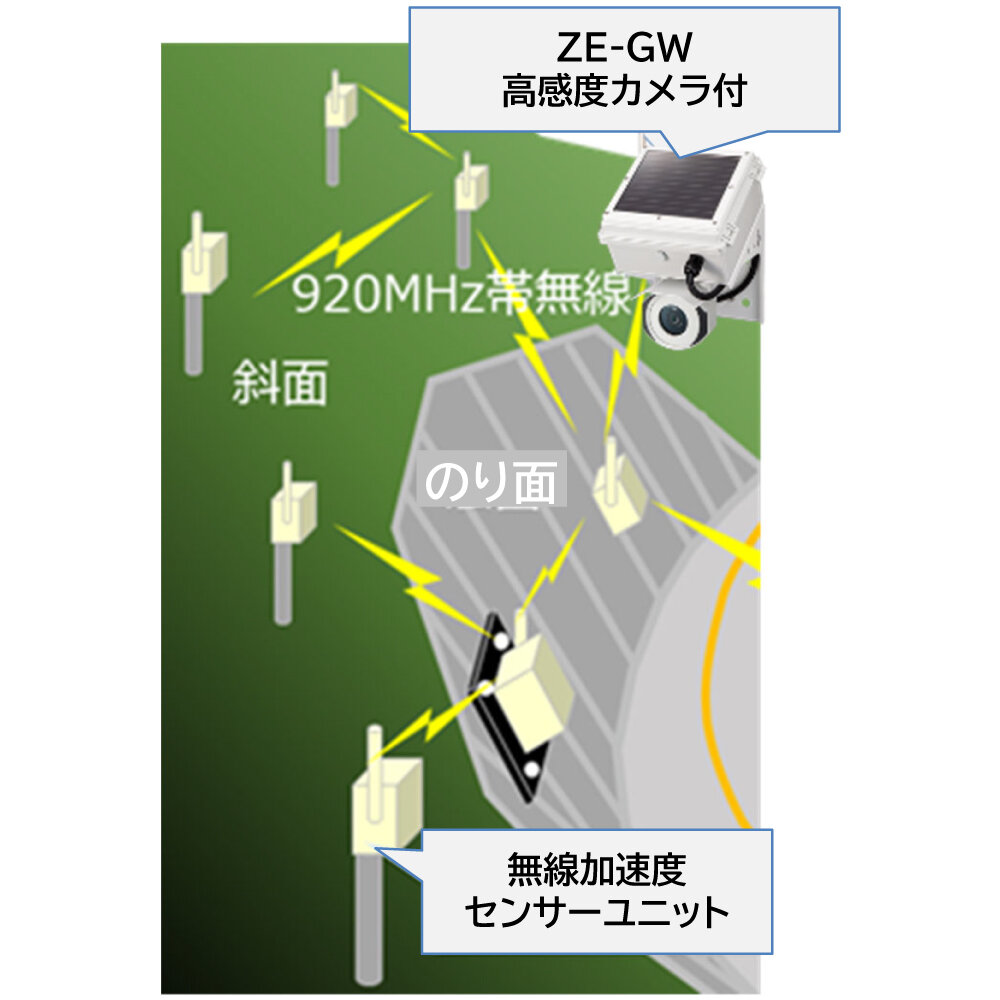 高感度カメラは、OKI独自開発の低消費電力・高感度カメラモジュールを搭載し、夜間など暗い低照度環境でも照明を用いず鮮明に撮影し、その画像を遠隔から確認できる。各センサーと連携した動作が可能であり、傾き、加速度、水位の計測値がしきい値を超えた際にセンサーが無線で送信する警報信号を受信し、これを契機に即時の撮影と撮影間隔の自動変更を行うことができる。ZE-GW本体部と高感度カメラを一体化したタイプも、不日照動作期間は9日間を達成する。
