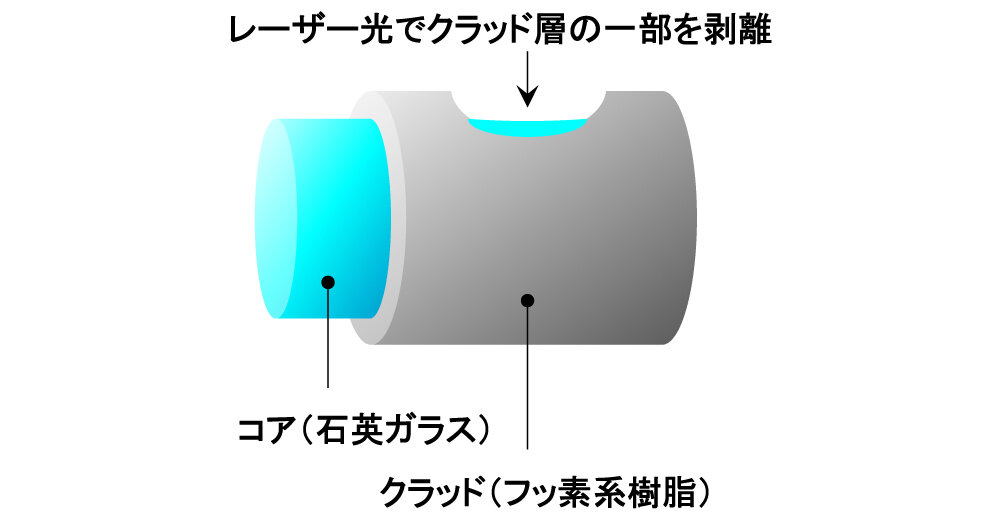 HPCF型光ファイバーは、クラッドがフッ素樹脂で構成されているため、表面に強いレーザー光を照射することにより、レーザー光が当たった部分のクラッド樹脂を剥離できる(図1)。実際に加工されたHPCF型光ファイバーの加工例を写真2に示す。