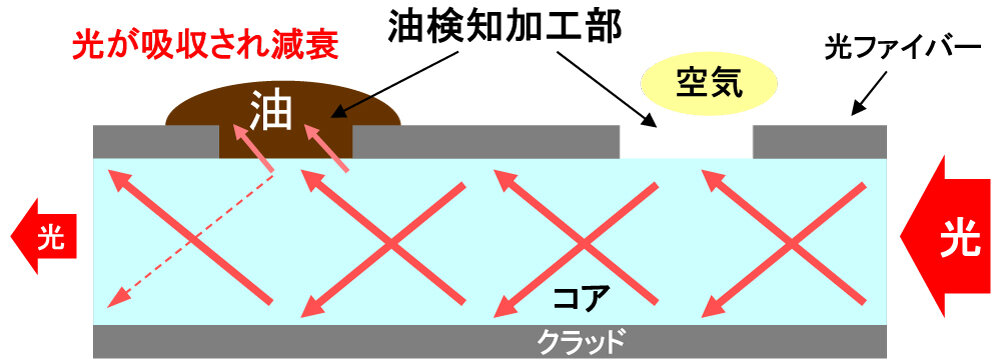 クラッド樹脂が剥離し露出したコアの部分に油が付着すると、空気と油の屈折率の違いにより、コア内部を伝送する光が外部へ漏れ、光量が減衰することで油付着を検知する(図2)。