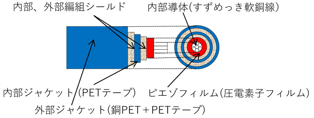 圧電樹脂被覆の代わりにピエゾフィルムを使用した振動センサーケーブルである。極薄(厚さ:28µm=0.028mm)のピエゾフィルムを使用することで、超細径化を実現したセンサーケーブルである(図4)。外径はφ0.7とシャープペンシルの芯並みであり、狭小部での配線や振動検知に最適である。