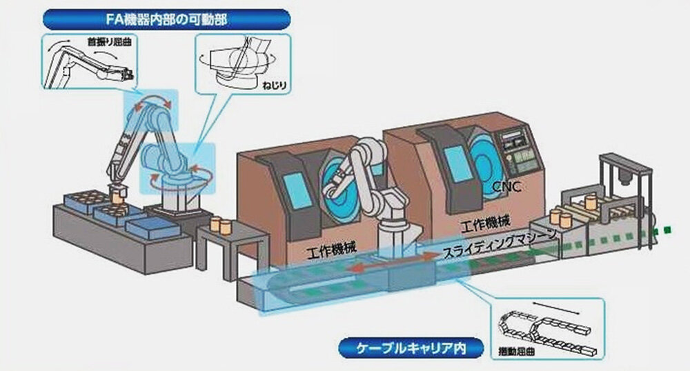 用途は図5に示す産業用ロボットのアーム内、モーター内部、ベアリング部等の振動検知である。特長である超細径構造により、狭小部の配線や振動検知が容易である。モーターなどで発生する通常稼働時の振動とは異なる異常振動を検知し、故障や製造ライン等での稼働停止に至る前に知らせる予知保全への展開が期待できる。製品化に向け、引続き技術検討を行う。