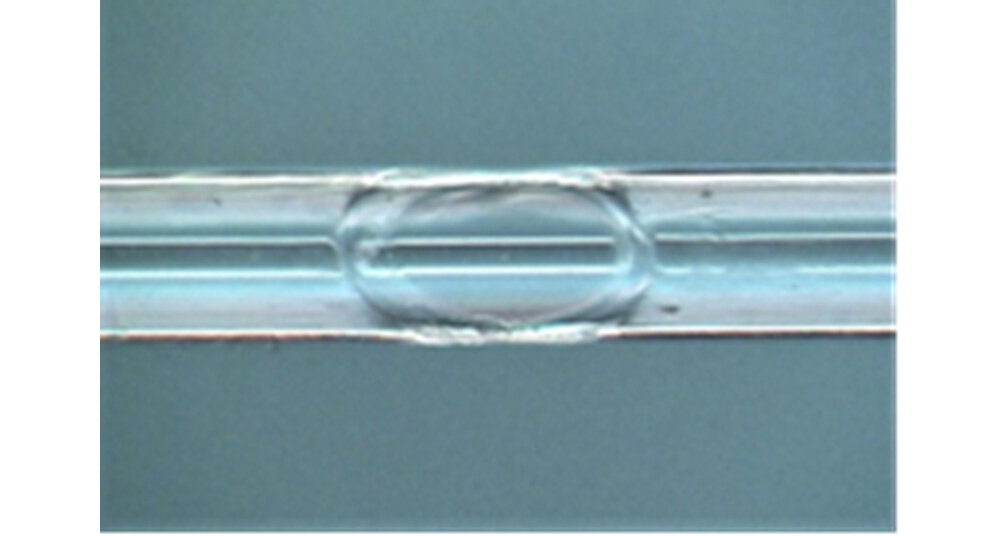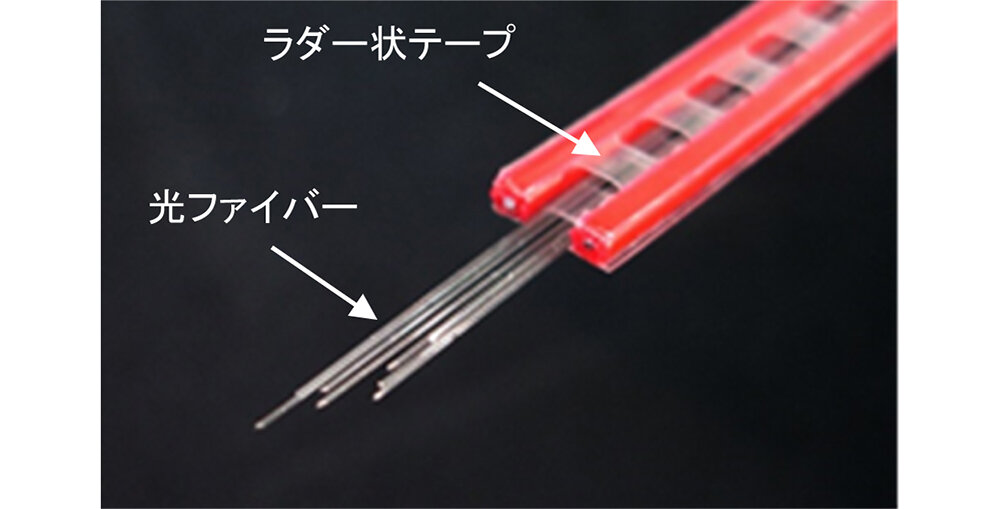 このレーザー加工をHPCF型光ファイバーに対して約10mm間隔で行い、さらに検知感度を高めるためHPCF型光ファイバーを複数本束ね、写真1に示す構造のケーブル内に収納する。ケーブルは一定の距離を開けて配した2本の支持線と、この支持線を保持し、外部から油が侵入しやすいよう一定間隔に穴が開けられた透明フィルムを上下から融着し、2本の支持線間にHPCF型光ファイバーをフリーな状態で保持した構成とした。