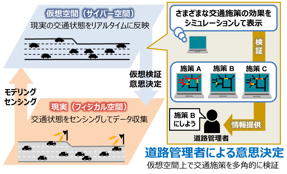 デジタルツインとは、センシングなどによって収集した現実の観測データをもとに、仮想空間上で現実の状態を再現する技術のことである。再現した仮想空間を現実の「仮想的な双子」と見立ててデジタルツインと呼ばれている。現実を精度よく再現したデジタルツインを構築することで、その先の未来もより現実に即してシミュレートすることが可能になる。精度の高い仮想空間で現実の未来予測・分析や将来製品の試作などを実施できればコストの削減や品質の向上に繋がる。交通分野で考えると、デジタルツインを活用することでさまざまな交通施策の効果を多角的に検証することができ、道路管理者は事故削減・渋滞緩和に向けた最適な意思決定を行える(図1)。