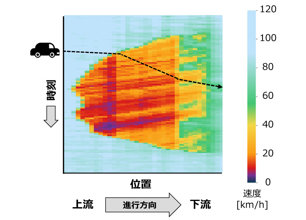 交通プローブデータをもとに縦軸を時刻、横軸を位置として、各時空間に記録時の平均速度を色付けすると道路情報を可視化できる(図2)。図2の黒点線はある車両の走行軌跡をイメージしたものである。図2では車両は左から右へ走行し、平均速度が高い色の薄い領域ではスムーズに移動できるが、平均速度が低い色の濃い領域では移動に時間がかかる様子を表している。このように、交通プローブデータから得られる情報によってリアルタイムに交通流を把握することができる。