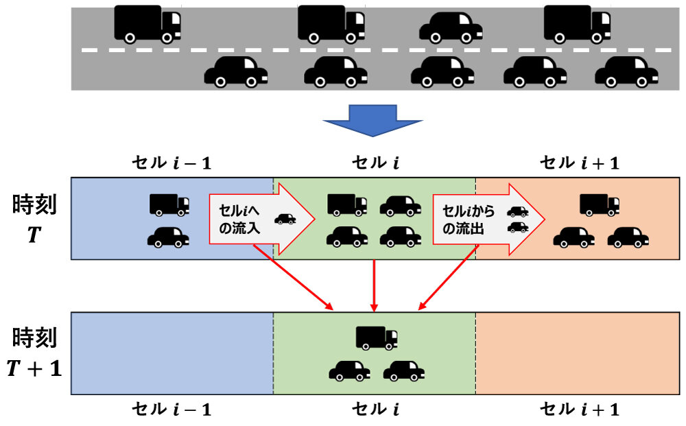 CTMは交通流を流体と捉えたモデルであり、道路を単位区間(セル)に区切って、各セルに関して車両台数が保存するように各セルへ流入・流出する交通量の変化を計算する。具体的に言えば、セル内の車両台数から流出する車両台数を引いて流入する車両台数を足すことで次時刻の車両台数を計算するイメージである(図3)。交通集中渋滞は、たとえば高速道路では上り坂やサグ部(下り坂から上り坂に変化する凹部)、トンネル入り口や車線数減少地点などにあたる箇所を起点として、流入できる限界の交通量を超えた場合に発生する。渋滞が発生する閾(しきい)値となる交通量を交通容量といい、道路の特性などによって異なる。この交通容量はモデルパラメーターの一つであり、CTMには交通容量のほかにも、セル内に許容できる車両台数を表す最大交通密度や、発生した渋滞が上流へ延伸していく速度を表す渋滞伝播速度といった複数のパラメーターが含まれる。