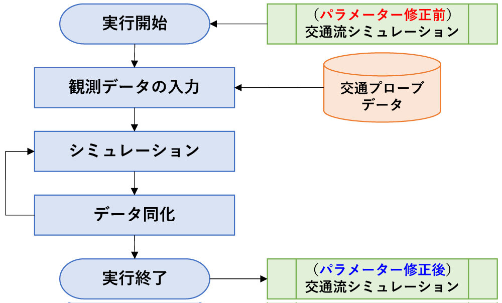 まず、観測データを入力する。観測データはシミュレーションの初期条件作成やデータ同化に使われる。本研究では観測データとして交通プローブデータを用いるが、交通プローブデータは道路上に設置されたトラフィックカウンター(定点観測器)のデータとは異なり、走行車両からの各地点での情報が得られるため、データ同化をより効果的に行うことができる。次に、シミュレーションとデータ同化を実行する。本研究ではアンサンブルカルマンフィルターと呼ばれるデータ同化手法を扱う。アンサンブルカルマンフィルターはシミュレーション結果に対するデータ同化を逐次行う手法であり、あらかじめ定めた時間ステップごとにシミュレーションとデータ同化によるモデルパラメーターの修正を繰り返し実行する。すなわち、モデルパラメーターは時間ステップごとに徐々に修正されていく。このプロセスにより、初めは現実に合わない結果を出力するシミュレーション設定でも、最終的に適切なモデルパラメーターに修正されて現実に即したシミュレーションが実行可能になる。