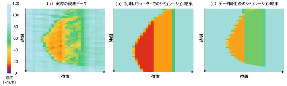 データ同化技術を適用することで交通流シミュレーションの精度が改善される結果例を図5に示す。図5(a)、(b)、(c)は図2のように時空間で速度情報を可視化したものである。図5(a)は実際の観測データ、図5(b)は過去データから概算して用意した初期パラメーターでのシミュレーション結果、図5(c)はデータ同化技術適用後のシミュレーション結果を示している。図5(b)は図5(a)に比べて渋滞が過剰にシミュレートされ、渋滞の時空間的な形状や各セルの平均速度などに大きな違いがある。一方で、図5(c)はデータ同化によって実際の交通流に近いシミュレーション結果になっていることが分かる。これは交通流シミュレーションのモデルパラメーターが初期値から修正されたためである。直接測定ができないパラメーターは、過去データから概算することはできても実態に合うような細かな調整が難しいため、データ同化によるパラメーター推定は非常に有効である。