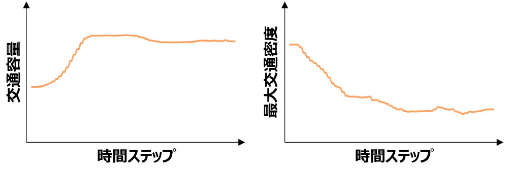 交通流シミュレーションのモデルパラメーターのうち、例として渋滞起点となる箇所の交通容量とセルの最大交通密度について、データ同化技術によってモデルパラメーターの値が修正される過程を図6に示す。縦軸が各パラメーターの値、横軸が時間ステップ(シミュレーションとデータ同化の実行間隔)である。時間ステップごとのデータ同化によって初期値からパラメーターが変化していき、やがて一定の値に収束していく様子が見られる。