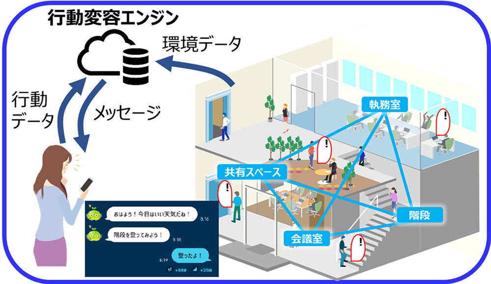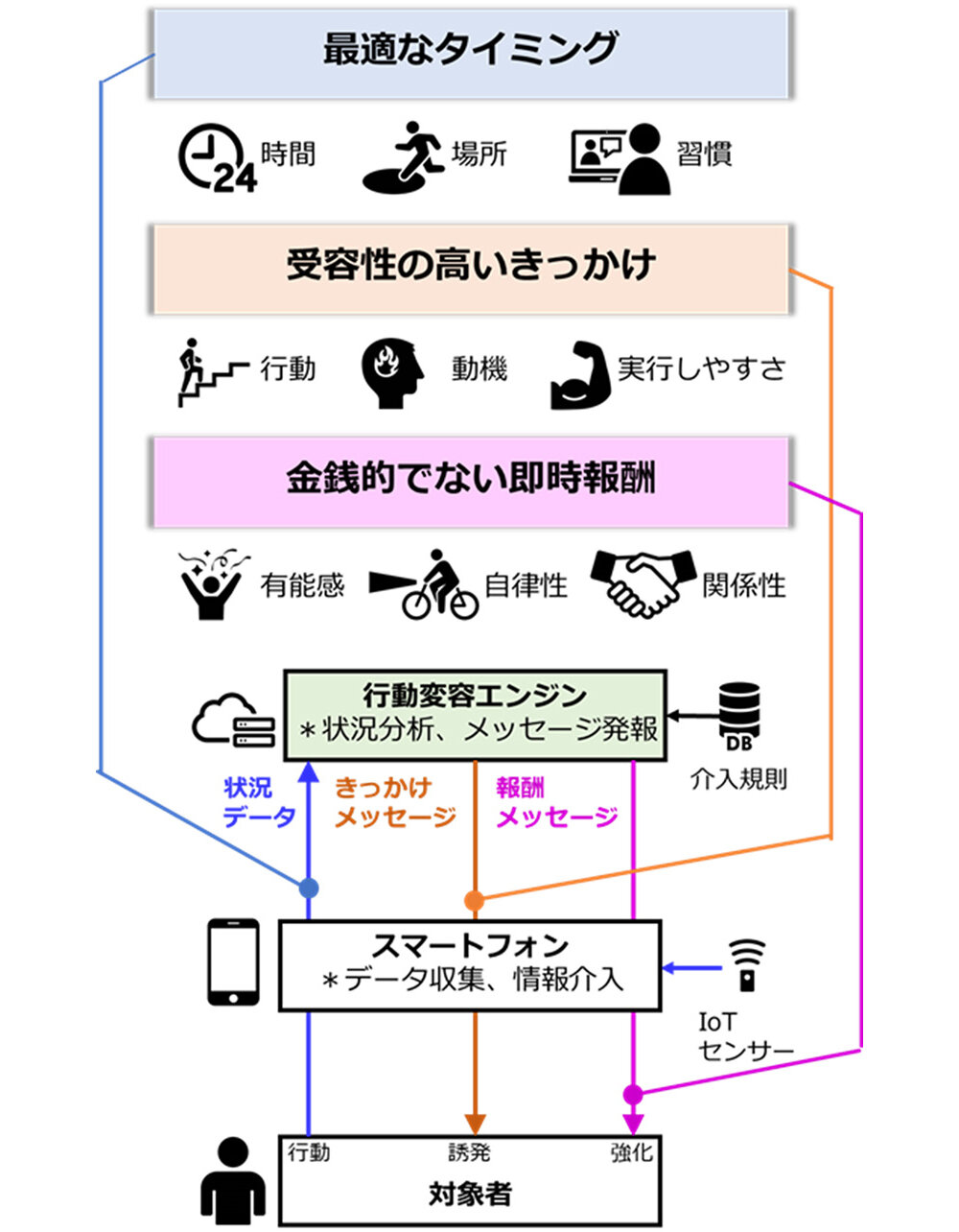 OKIのメッセージの特徴は、行動をしやすい最適なタイミングできっかけを与え、期待される行動の直後にその行動を褒めるメッセージを報酬としてスマートフォンで通知することにより、利用者の健康意識を高め、行動の習慣化を支援する点である。メッセージを通知する状況やメッセージ内容(介入規則)については、行動科学や健康行動に基づいて設計している。また利用者ごとに個別化された適切なメッセージを送るために、スマートフォンや環境に設置したセンサーなどで収集されるデータを蓄積、分析している(図2)。