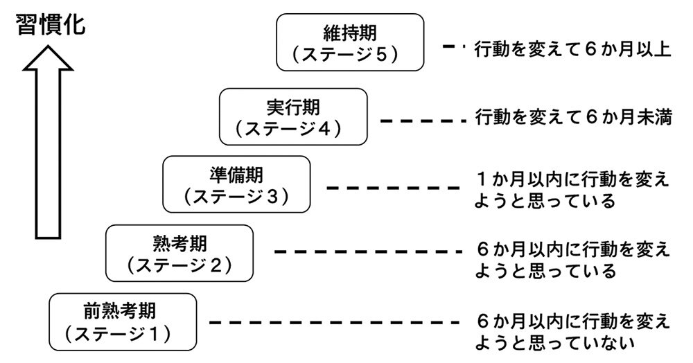 前熟考期・熟考期はまだ習慣化すべき行動を行っていない状態であり、実行期・維持期は行動を行っている状態、準備期はその中間にあたる。各ステージに適したメッセージを利用者に伝えることで先のステージに進み、行動の習慣化に繋がると言われている。