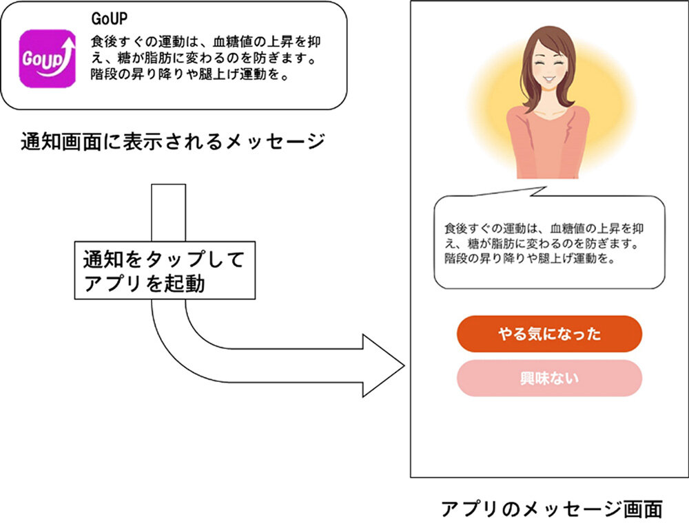 行動変容のメッセージに関しては、利用者の階段利用数・歩数を逐次サーバーにアップロードする機能、あらかじめ環境に配置したビーコンの検知機能を備えている。サーバー側では、これらの情報を蓄積して利用者へ送るメッセージの個別化に使用している。利用者に対しては、図4の画面イメージのように、通知メッセージの表示機能、通知メッセージのタップによるアプリのメッセージ画面での表示機能、過去に受信したメッセージをアプリ内で確認できる履歴機能を備えている。