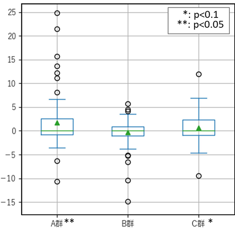図5は、介入前後での参加者の平均階段利用階数の差の箱ひげ図である。きっかけメッセージを含むA群は階段利用階数が有意に増加し、Tips量の多いC群は増加傾向であった。また、A群は介入後の階段利用階数の増加した人の割合が56.1%と一番多く、5階以上増加した人数も約10%と他群と比べて大きな効果が見られた。