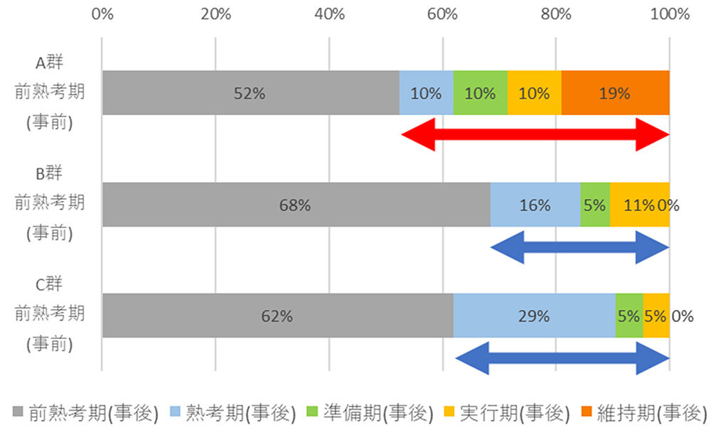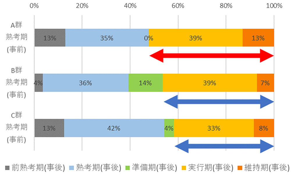 図7は熟考期から実際に行動を起こした(実行期と維持期へ移行)した人数の割合である。A群の約半数が行動に移したと回答し、他群より若干割合が高い。また、A群の熟考期では、表2で示したように有意に階段利用階数が増えている。ここから、意識を伴って実際に階段利用をするようになった人が多いと考えられる。一般的に、前熟考期に対して行動変容させることは難しいとされ、行動変容させるには意識の向上により熟考期へ移行させ、きっかけとなる介入により行動させる手法が必要である。今回の結果より、A群は長期間の利用により、前熟考期の意識向上および階段利用増加への効果も期待できることが示された。