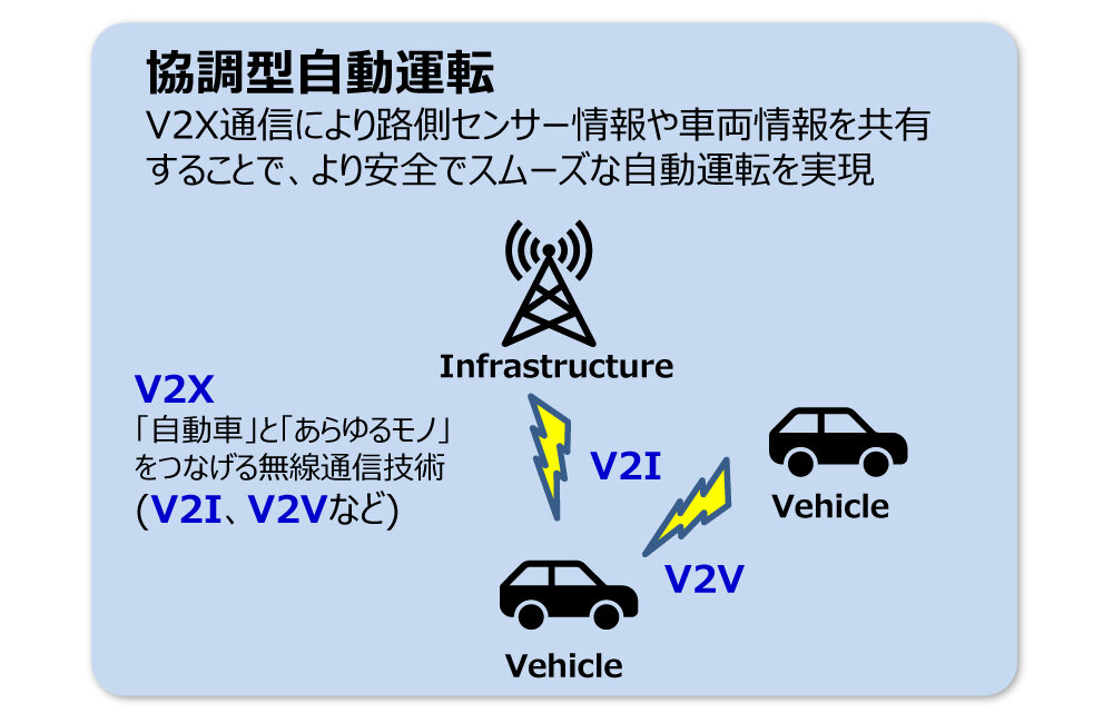 しかし、ビルや壁などによる死角がある街中で運転手を必要としない完全自動運転(レベル4~5)を実現するためには、V2X(Vehicle to Everything)通信技術により周囲の車両情報や交通情報を互いに共有する「協調型」の自動運転システムが必要になる(図1)。