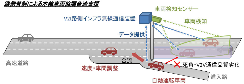たとえば、高速道路の合流部では、進入路の走行車両からは遮音壁や高欄の存在や高低差により本線の走行車両の確認ができないケースが想定されるため、V2I通信により路側車両検知センサー情報や走行車両情報を互いに共有することで路側管制による本線車両協調合流支援での自動運転が実現できる(図2)。