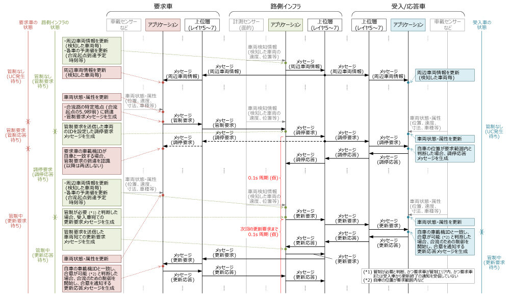 SIP協調型自動運転ユースケース(SIP UC)(参考文献3)を5.9GHz帯で実現するための通信プロトコル案の、プロトコルスタック、通信制御フロー、通信諸元(機能、動作、インターフェース)を整理した。欧米の通信プロトコル仕様をベースにユースケースの実現可能性を検討し、「管制/合意」に対応するため新たな機能(宛先の特定、要求/応答処理)を追加した。また、ITS情報通信システム推進会議(以下、ITSフォーラム)による通信シナリオ案(ITS FORUM RC-017(参考文献4))に基づく通信シーケンスを詳細化し、アプリケーション、各プロトコルスタック、情報提供元の関係を整理することで、妥当性を確認した。図3に通信シーケンス例を示す。