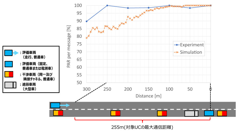 通信チャネル割当て効果は、高速道路の合流部および一般道の交差点での各チャネルの通信トラフィック量を模擬した環境下で通信性能を測定し、シミュレーション結果と比較して評価した。