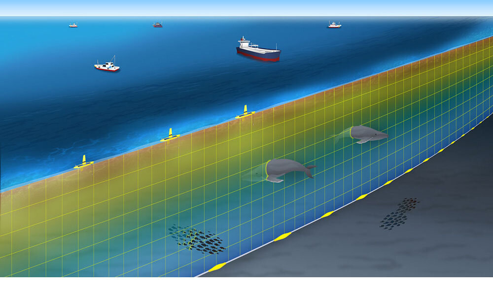 OKIは独自のAI技術による「音」の識別に関する研究を行っており、海底から海面までを常時監視を実現する「鉛直断面観測システム」の構築を、JSTのもとでJAMSTECと協力しながら進めます。音響センサーを取り付けたケーブルを海底に敷設し、海底から海面までをカーテンを引くように海中音を常時観測することで、海面や海中を移動する船舶や生物などを識別検知し、海洋分野の安全に貢献します。