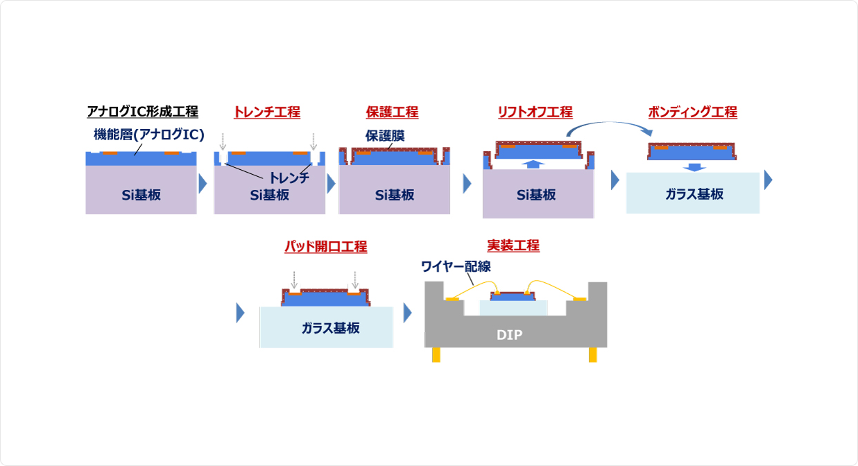 まず、実証①のプロセスをベースに、トレンチ工程からリフトオフ工程までを実施し、薄膜アナログICを準備した。