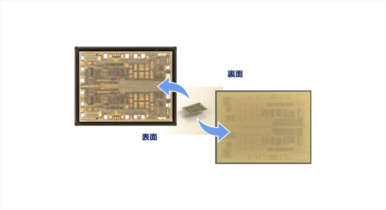 ボンディング工程では、リフトオフした薄膜アナログICをガラス基板上に分子間力接合した。ガラス基板の上面(表面)側も下面(裏面)側共に損傷はなく、接合部分には気泡もなく、良好に接合されていることが確認できた(図2)。