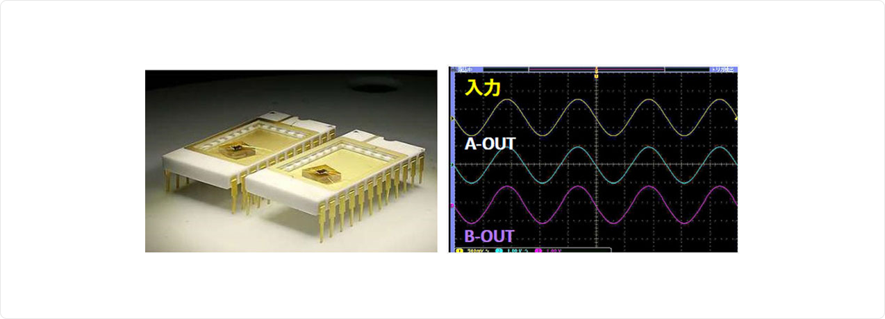 このアナログICに動作テスト用の電気信号を入力したところ、量産品と同等の入出力特性を得ることができた(図3)。さらに、実際にオーディオシステムに接続し信号増幅を行ったが、違和感のないクリアな音を再生可能であることが確認できた。以上により、多数のトランジスタを含む複雑な回路のアナログICであっても、接着剤を使用しないCFB技術により抵抗値や容量などの変化を抑制した接合ができた。すなわち、機能を損なうことなく、レガシープロセスで3次元集積が可能であることを実証できた。
