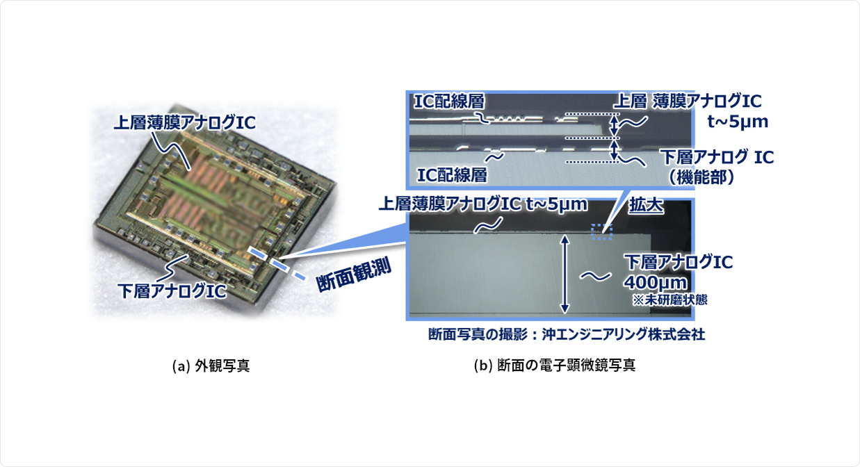 次に、下層アナログICへのボンディング工程を実施した。図4は接合後の(a)外観写真(b)断面の電子顕微鏡写真である。実証①のガラス基板とは異なり、IC表層には回路形成による数µmオーダーの凹凸がある。そのため、接着剤を使用しない分子間力接合を可能にする平坦化膜を形成した。これにより、実証①同様に薄膜アナログICを接合することに成功した。