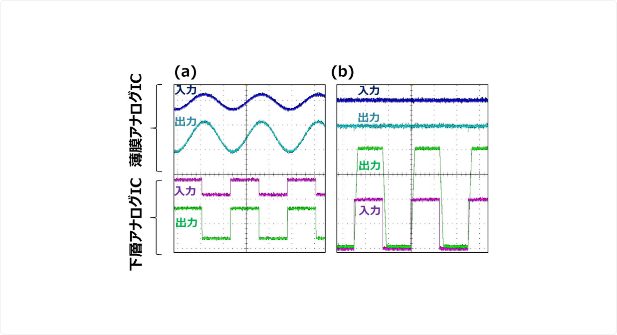 実証①同様に、パッド開口工程および実装工程を行い、特性の評価を行った。図5はテスト信号で測定した出力特性を示している。まず、下層アナログICには矩形波を、薄膜アナログICには正弦波を同時に入力した。その結果、いずれのICも仕様どおり2倍の電圧増幅特性が確認できた(図5(a))。次に、下層アナログICに比較的大きなピーク電圧(10V)の矩形波を入力し、薄膜アナログICは0V(オフ状態)とした。その結果、下層アナログICは同様に仕様どおり2倍の電圧増幅特性が得られ、薄膜アナログICの出力は影響を受けることなく0Vであることが確認できた(図5(b))。そのほかにも消費電流や入力オフセット電圧など主要特性を測定したが、2種類のチップを単体で動作させた場合と顕著な違いはなかった。これにより、課題2を解決した3次元集積が可能であることを実証した。
