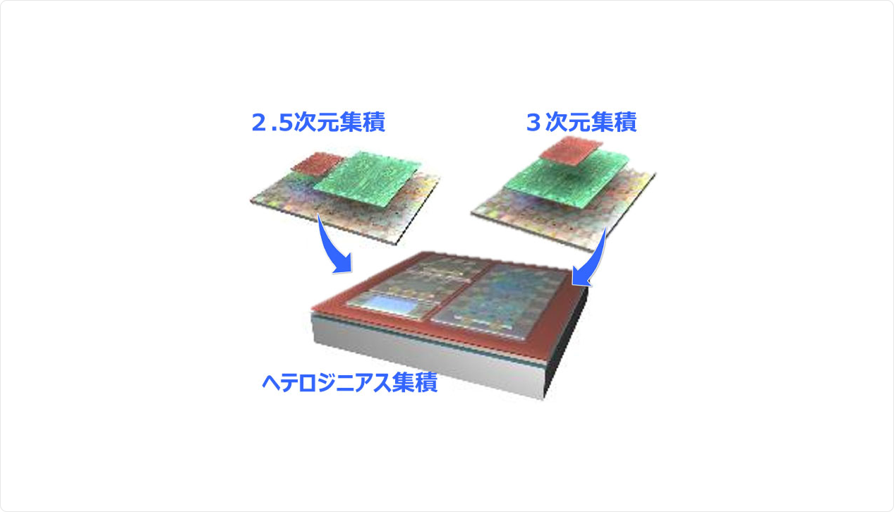 - 半導体で、異なる技術や素材を組み合わせて、一つのシステムを構築する集積技術。