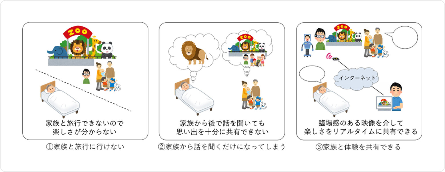 双方向CDNを使う場面を、家族や友人などのグループが情報通信技術を使って動物園をツアーするような遠隔動物園ツアーサービス(Remote Zoo Tour Service 以下、RZTS)を例として説明する。現状、図2の①のように外出困難な方は家族や友人と旅行ができないのでその旅行の楽しさを家族で共有できない。旅行が終わってから、図2の②のように外出困難な方が家族や友人から旅行の話を聞いても楽しい思い出を十分に共有することができない。この課題を解決するために、双方向CDNを用い、図2の③のような旅行中リアルタイムにコミュニケーションをとり、旅行体験を共有できるRZTSの社会実装を目指し開発を行っている。