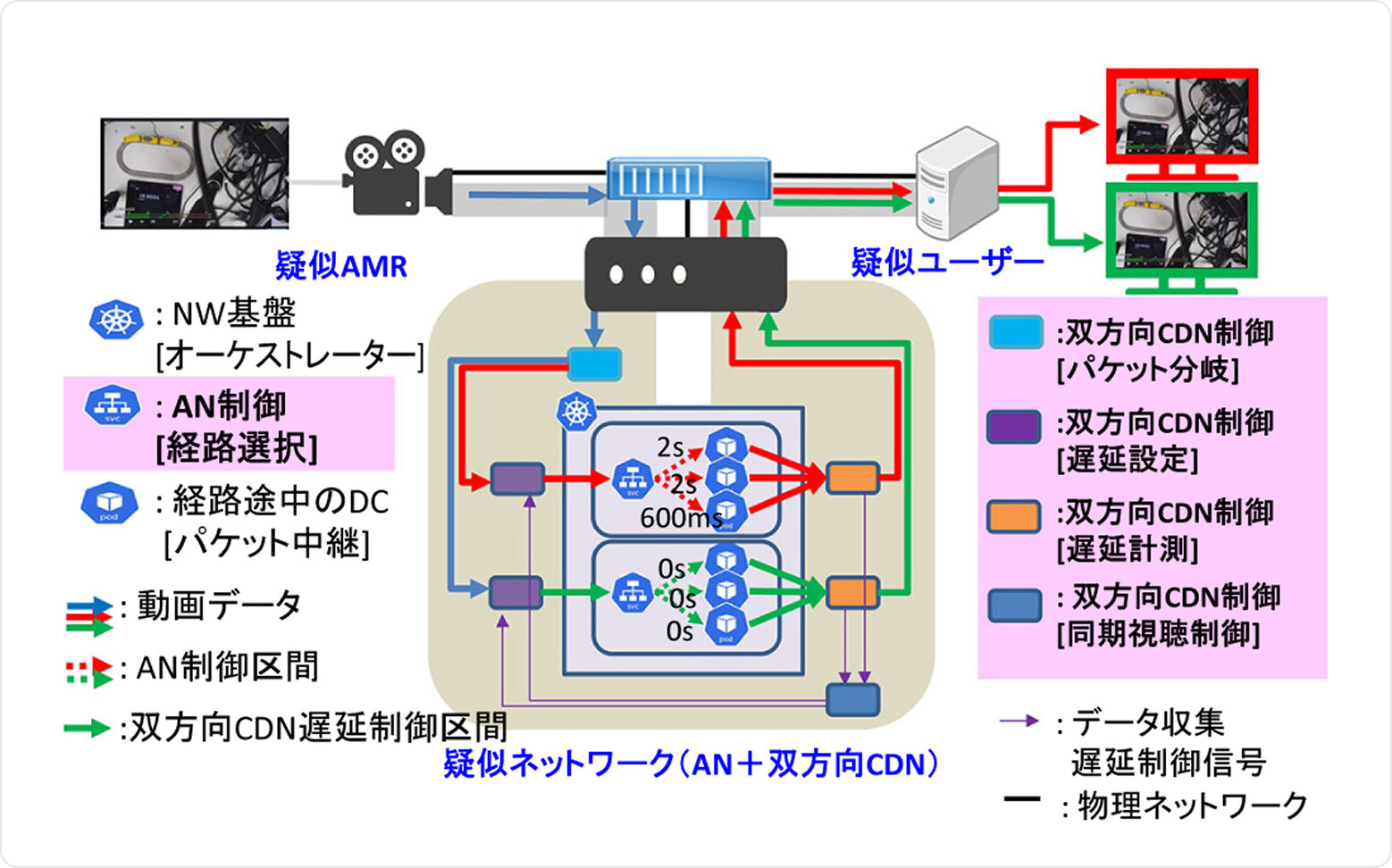 図3は同期視聴プロトタイプの構成図である。図3のAMRを想定した疑似ロボットのカメラで撮影しエンコードした動画データを双方向CDNに送る。続いて、双方向CDN[パケット分岐]にて動画データを2つに分岐させ、双方向CDN[遅延計測]でそれぞれ遅延を計測する。双方向CDN[遅延計測]から送られた動画データはそれぞれANにて遅延を減少させるための経路を選択し迂回する。さらに、双方向CDN[遅延設定、同期視聴制御]にてANで調整できない遅延に対する制御を行う。その後、疑似ユーザーが視聴する2つの動画データは同期がとれた状態となる。