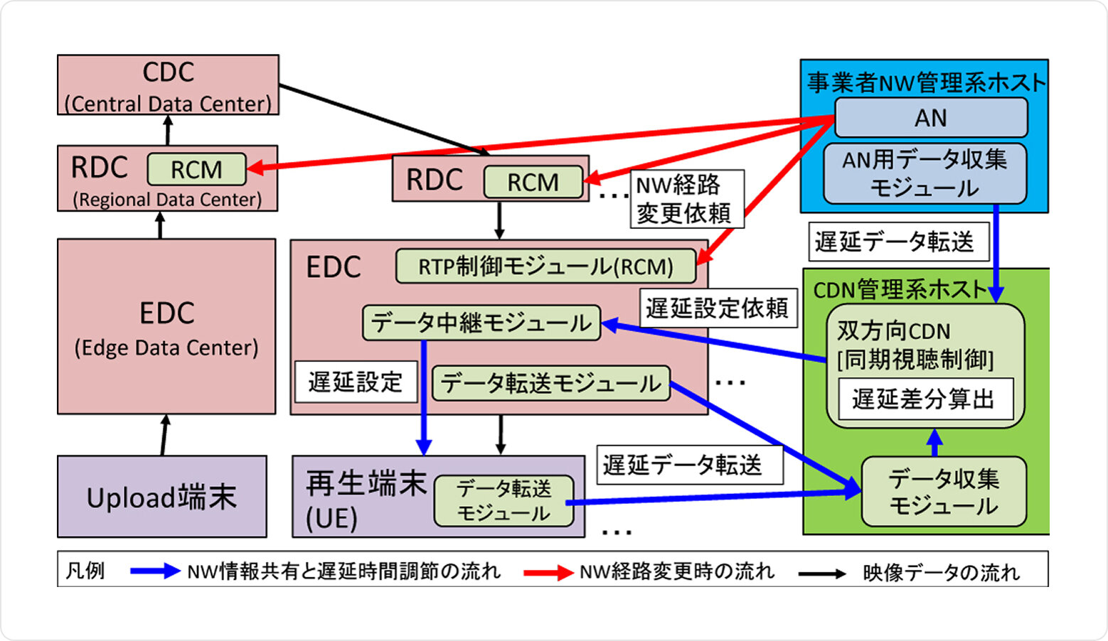 ①ではANと双方向CDNの双方が管理するNW情報を収集するモジュールを設計し、各制御部からお互いのNW情報参照方式を検討しプロトタイプ上に実装した。この連携により、図4の青矢印のようなANのNW情報を用いた複数端末間の同期視聴制御を行うことが可能となる。②ではNW経路上のデータ中継モジュールのAPIを設計し、ANの要求に従ったデータ送受信先の変更を可能とした。この連携により、図4の赤矢印のようなAN制御下のNW経路変更(最適化、障害迂回など)を双方向CDNの配信経路に反映することが可能となり、同期視聴制御時の転送遅延時間を最小の状態に維持することが可能となる。