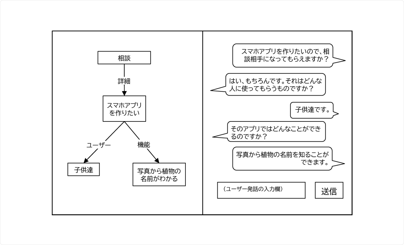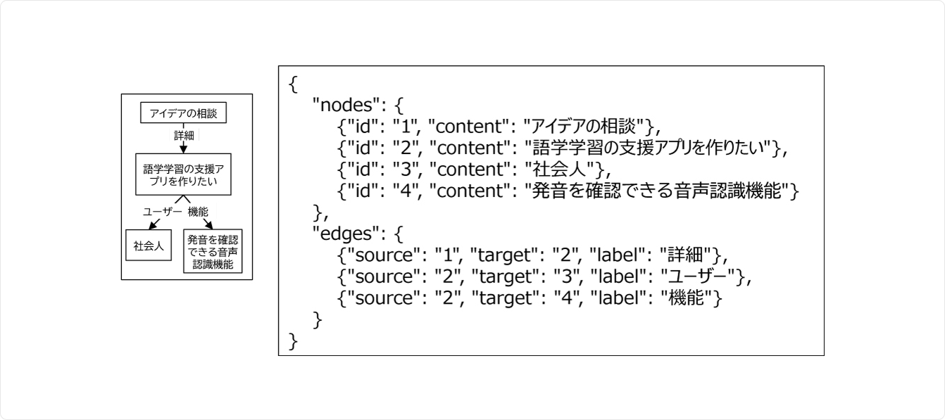 これはLLMに現在のグラフ文書とユーザー発話を渡し、ユーザーへのメッセージ生成に加えて、その内容を要約した追加ノードと追加エッジを生成させることにより実現した。