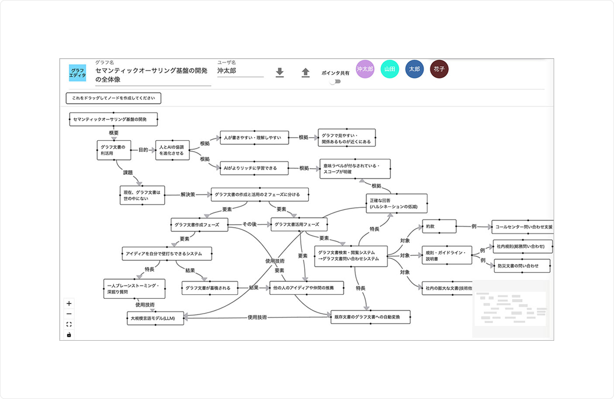 グラフエディターは、シンプルなGUIとし、複数人で同時に同じグラフ文書を編集可能としたため、ブレーンストーミングやアイデア出しを効率的に行うことができる。考えていることをグラフ文書に書き出してみることで、内容や構造が整理でき、考慮漏れや項目同士の矛盾点に気づいたり、新たなアイデアを思いついたりすることもできる。