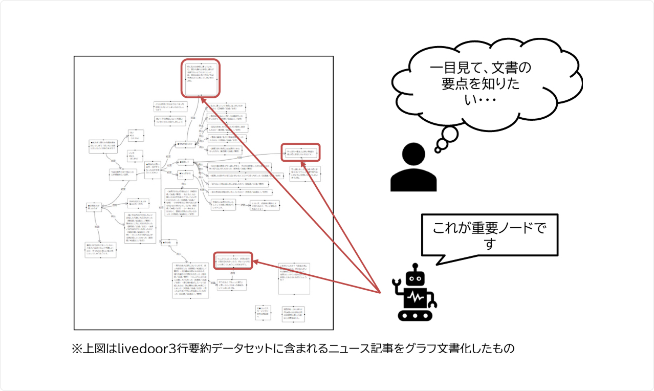 グラフ文書は、文書の持つ論理構造が分かりやすい反面、ノード数が増えると、可読性が低下し、文書の要点が分かりづらくなるという課題がある。そこでこの課題を解決するため、グラフ文書要約手法の研究開発に取り組んでいる。